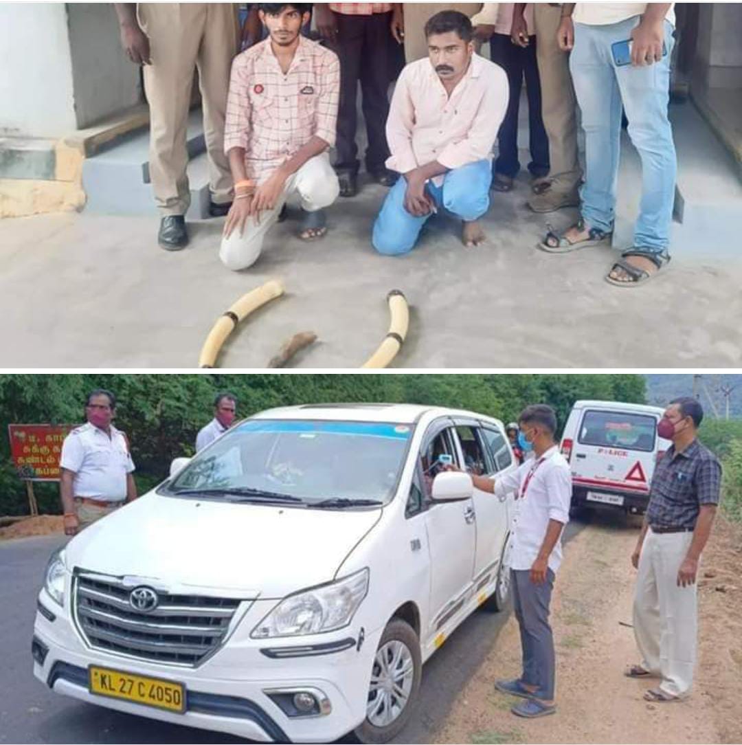 തേനി ജില്ലയിലേക്ക് വ്യാപകമായി ആനക്കൊമ്പ് കടത്തുന്നതുമായി ബന്ധപ്പെട്ട് ഏതാനും ആഴ്ചകള്ക്ക് മുമ്പ് സെന്ട്രല് വൈല്ഡ് ലൈഫ് ക്രൈം കണ്ട്രോള് ബ്യൂറോയ്ക്ക് വിവരം ലഭിച്ചിരുന്നു. ഇതേ തുടര്ന്ന് സെന്ട്രല് വൈല്ഡ് ലൈഫ് ക്രൈം കണ്ട്രോള് ബ്യൂറോ ഇന്സ്പെക്ടര് രവീന്ദ്രന്റെ നേതൃത്വത്തില് കമ്പം വെസ്റ്റ് ഫോറസ്റ്റ് വാര്ഡന് സ്റ്റാലിനും വനംവകുപ്പ് ഉദ്യോഗസ്ഥരും ഇന്നലെ ഉച്ചയോടെ കമ്പം- കുമളി റോഡിലെ അപ്പാച്ചെ ഫാം പരിസരത്ത് വാഹന പരിശേധ നടത്തി വരവെയാണ് പ്രതികള് പിടിയിലായത്.