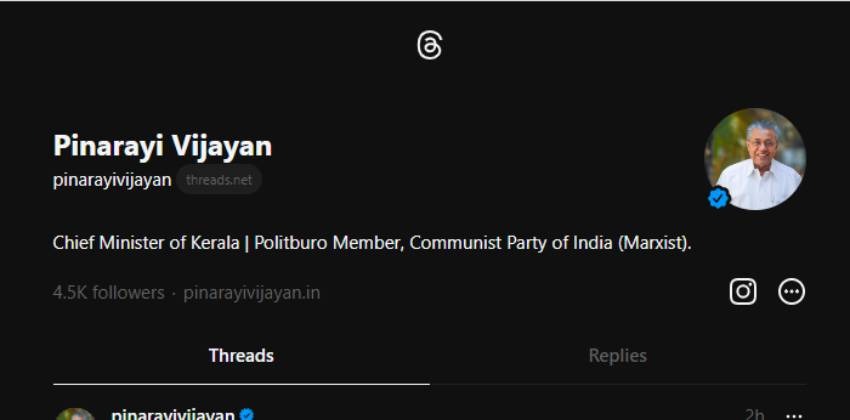 മെറ്റയുടെ സോഷ്യല് മീഡിയ ആപ്പായ ത്രെഡ്സില് ഉപയോക്താക്കളുടെ എണ്ണം വളരെ വേഗത്തില് ഉയര്ന്നുകൊണ്ടിരിക്കുകയാണ്. നിരവധി പ്രമുഖര് ത്രെഡ്സില് അക്കൗണ്ടെടുത്തു കഴിഞ്ഞു. ഇപ്പോഴിതാ കേരള മുഖ്യമന്ത്രി പിണറായി വിജയനും ത്രെഡ്സിലെത്തിയിരിക്കുകയാണ്.