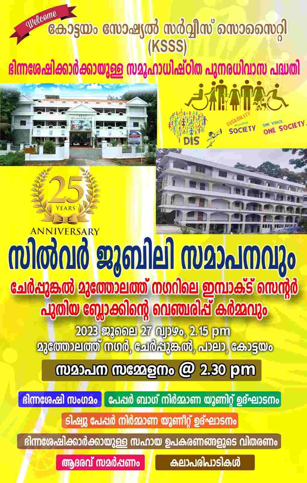 സില്വര് ജൂബിലി സമാപന ആഘോഷങ്ങളുടെ ഭാഗമായി രാവിലെ 10.30 മുതല് ഭിന്നശേഷി സംഗമവും മുഖാമുഖം പരിപാടിയും സെമിനാറും ഭിന്നശേഷിയുള്ള കുട്ടികളുടെ കലാപരിപാടികളും നടത്തപ്പെടും. ഉച്ചകഴിഞ്ഞ് 2.15 ന് ചേര്പ്പുങ്കല് മുത്തോലത്ത് നഗറില് നിര്മ്മാണം പൂര്ത്തിയാക്കിയ ഇമ്പാക്ട് സെന്റര് പുതിയ ബ്ലോക്കിന്റെ വെഞ്ചരിപ്പ് കര്മ്മവും നടത്തപ്പെടും. കോട്ടയം ആര്ച്ച് ബിഷപ്പ് മാര് മാത്യു മൂലക്കാട്ട് മുഖ്യകാര്മ്മികത്വം വഹിക്കും. ജൂബിലി സമാപനത്തോടനുബന്ധിച്ച് ഭിന്നശേഷിയുള്ളവര്ക്ക് സ്വയം തൊഴില് വരുമാന സാധ്യതകള് തുറക്കുക എന്ന ലക്ഷ്യത്തോടെ പേപ്പര് ബാഗ് നിര്മ്മാണ യൂണിറ്റും ടിഷ്യു പേപ്പര് നിര്മ്മാണ യൂണിറ്റുമാണ് കെ.എസ്.എസ്.എസ് ആരംഭിക്കുന്നത്. ചിക്കാഗോ സെക്രട്ട് ഹാര്ട്ട് ക്നാനായ കാത്തലിക് ഫൊറോനാ ചര്ച്ചിന്റെ സഹകരണത്തോടെയാണ് ഭിന്നശേഷിയുള്ളവര്ക്ക് സഹായ ഉപകരണങ്ങള് ലഭ്യമാക്കുന്നത്. കൂടാതെ കെ.എസ്.എസ്.എസ് സമൂഹാധിഷ്ഠിത പുനരധിവാസ പദ്ധതി സ്ഥാപനകനും പ്രസ്തുത പ്രവര്ത്തനങ്ങളുടെ തുടര്ച്ചയ്ക്ക് മാര്ഗ്ഗ ദീപവും പ്രോത്സാഹനവും പിന്തുണയും നല്കി വരുന്ന കെ.എസ്.എസ്.എസ് മുന് ഡയറക്ടര് റവ. ഫാ. എബ്രഹാം മുത്തോലത്തിനേയും കെ.എസ്.എസ്.എസ് സിബിആര് ഫെഡറേഷന് പ്രവര്ത്തനങ്ങളില് സഹകാരികളാകുന്ന സന്നദ്ധ പ്രവര്ത്തകരെയും ചടങ്ങിനോടനുബന്ധിച്ച് ആദരിക്കും. 1997 ലാണ് കെ.എസ്.എസ്.എസിന്റെ നേതൃത്വത്തില് ഭിന്നശേഷിയുള്ളവര്ക്കായുള്ള സമൂഹാധിഷ്ഠിത പുനരധിവാസ പദ്ധതിക്ക് തുടക്കം കുറിച്ചത്. ഭിന്നശേഷിക്കാര്ക്കായുള്ള സ്വാശ്രയസംഘങ്ങള്, അഗാപ്പെ സ്പെഷ്യല് സ്കൂളുകള്, സ്വയം തൊഴില് പരിശീലനങ്ങള്, സംരംഭകത്വ വികസന പദ്ധതികള്, മെഡിക്കല് ക്യാമ്പുകള്, അവശ്യ മരുന്നുകളുടെ വിതരണം, സഹായ ഉപകരണങ്ങളുടെ വിതരണം, വിദ്യാഭ്യാസ ആരോഗ്യ ക്ഷേമ പ്രവര്ത്തനങ്ങള്, ചികിത്സാസഹായ പദ്ധതി, വിവിധ സംഗമങ്ങള്, ബോധവത്ക്കരണ പ്രവര്ത്തനങ്ങള്, അവകാശ സംരക്ഷണ പ്രവര്ത്തനങ്ങള്, ആനുകൂല്യങ്ങളുടെ ലഭ്യമാക്കല്, പഠനോപകരണങ്ങളുടെ വിതരണം, പ്രളയ ദുരിതാശ്വാസ പ്രവര്ത്തനങ്ങള്, കോവിഡ് അതിജീവന പ്രവര്ത്തനങ്ങള്, അന്ധ ബധിര പുനരധിവാസ പദ്ധതി തുടങ്ങിയ നിരവധിയായ പ്രവര്ത്തനങ്ങള് പദ്ധതിയുടെ ഭാഗമായി കെ.എസ്.എസ്.എസ് നടപ്പിലാക്കി വരുന്നു. അന്ധ ബധിര വൈകല്യമുള്ളവരുടെ സമഗ്ര ഉന്നമനം ലക്ഷ്യമാക്കിയുള്ള സംസ്ഥാനതല പഠനകേന്ദ്രവും റിസോഴ്സ് സെന്ററും കെ.എസ്.എസ്.എസിന്റെ നേതൃത്വത്തില് പാലാ ചേര്പ്പുങ്കല് ഗുഡ് സമരിറ്റന് റിസോഴ്സ് സെന്ററില് പ്രവര്ത്തിച്ചുവരുന്നുണ്ട്. കെ.എസ്.എസ്.എസ് മുന് ഡയറക്ടര് റവ. ഫാ. എബ്രഹാം മുത്തോലത്ത് അച്ചന്റെ ദീര്ഘ വീക്ഷണത്തോടെയുള്ള പ്രവര്ത്തനങ്ങളുടെ ഭാഗമായിട്ടാണ് ഭിന്നശേഷിക്കാര്ക്കായുള്ള ക്ഷേമപ്രവര്ത്തനങ്ങള്ക്ക് കെ.എസ്.എ