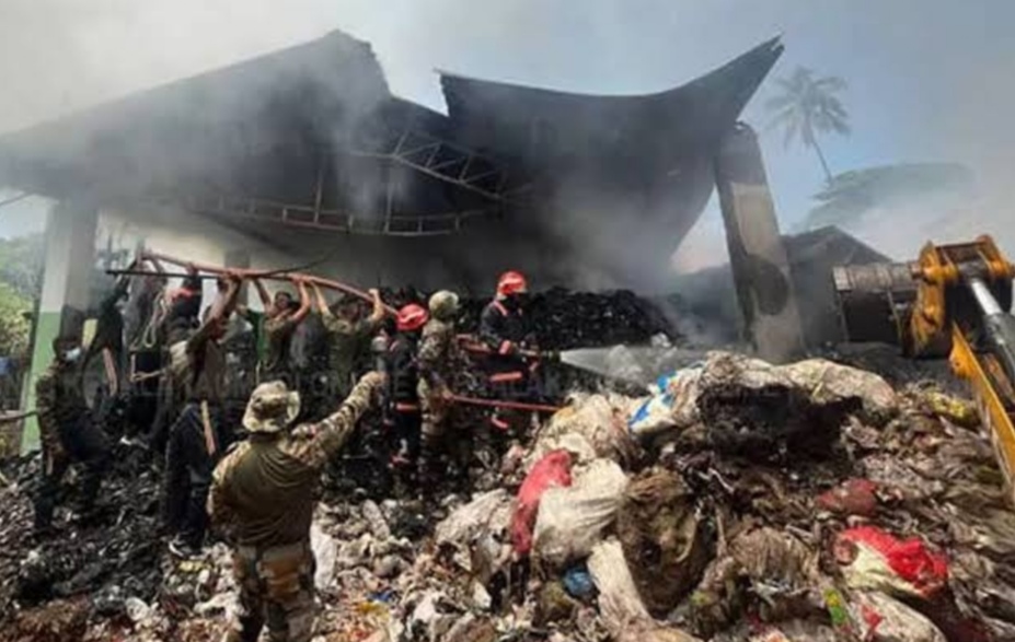 രാവിലെ എട്ടരയോടെ മാലിന്യക്കൂമ്ബാരത്തിന് തീപ്പിടിച്ചെന്നാണ് നാട്ടുകാര് പറയുന്നത്. പിന്നീട് തീ ആളിക്കത്തുകയായിരുന്നു.പ്ലാസ്റ്റിക് മാലിന്യങ്ങള്ക്ക് തീപ്പിടിച്ചതിനാല് വലിയതോതില് പുകയും ഉയരുന്നുണ്ട്. തീയണയ്ക്കാനുള്ള അഗ്നിരക്ഷാ സേനയുടെ ശ്രമങ്ങള് തുടരുകയാണ്. അഗ്നിരക്ഷാ സേനയ്ക്കൊപ്പം നാട്ടുകാരും പോലീസും തീയണയ്ക്കാനുള്ള ദൗത്യത്തിലുണ്ട്.