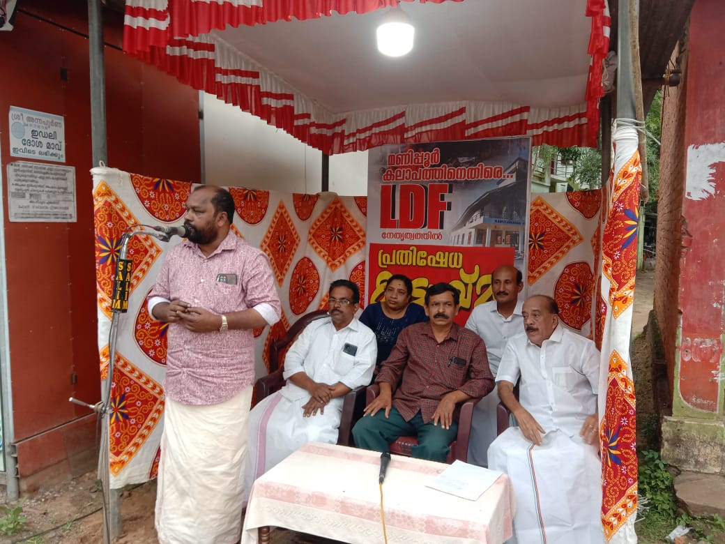 വൈക്കം : മണിപ്പൂർ കലാപത്തിൽ ബി.ജെ.പി ഗവൺമെന്റ് കൈക്കൊള്ളുന്ന നിലപാടുകൾക്കെതിരെ പ്രതിഷേധ കൂട്ടായ്മ സംഘടിപ്പിച്ചു. ടി.വി.പുരം കവലയിൽ ചേർന്ന കൂട്ടായ്മ സി.പി.ഐ കോട്ടയം ജില്ലാ അസ്സിസ്റ്റന്റ് സെകട്ടറി ജോൺ വി ജോസഫ് ഉദ്ഘാടനം ചെയ്തു. എൽ.ഡി.എഫ് കൺവീനർ കെ.വി.പ്രസന്നൻ അദ്ധ്യക്ഷത വഹിച്ചു. കേരള കോൺഗ്രസ്സ് (എം) ഉന്നതാധികാര സമിതി അംഗം പി.എം മാത്യു എക്സ്എംഎൽഎ , സി.പി.എം ഏരിയ കമ്മറ്റി അംഗം കെ.കെ.ശശികുമാർ, കവിത റജി, സി.പി.ഐ മണ്ഡലം കമ്മറ്റി അംഗം എം.എസ്.രാമചന്ദ്രൻ ,എസ്.ബിജു, ഇ എൻ.സാലി മോൻ , ടെൽസൺ തോമസ്, ഷിബു കോമ്പാറ, ബി. സദാ നന്ദൻ എന്നിവർ പ്രസംഗിച്ചു.