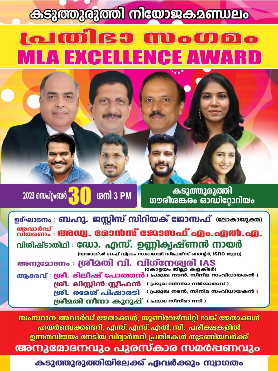 കടുത്തുരുത്തി നിയോജകമണ്ഡലത്തില് നിന്ന് എം.എല്.എ. എക്സലന്സ് അവാര്ഡിനുവേണ്ടി ആയിരം വിദ്യാര്ഥികളെയാണ് തെരഞ്ഞെടുത്തിരിക്കുന്നത്. ഇവരെ അനുമോദിച്ചുകൊണ്ടുള്ള പുരസ്കാര സമര്പ്പണം അഡ്വ. മോന്സ് ജോസഫ് എം.എല്.എ. നിര്വ്വഹിക്കുന്നതാണ്. കടുത്തുരുത്തി ബ്ലോക്ക് പഞ്ചായത്ത് പ്രസിഡന്റ് പി.വി.സുനില്, കടുത്തുരുത്തി ഗ്രാമപഞ്ചായത്ത് പ്രസിഡന്റ് എന്.ബി.സ്മിത എന്നിവര് അനുമോദന പ്രസംഗം നടത്തും. വിവിധ ഗ്രാമപഞ്ചായത്ത് പ്രസിഡന്റുമാര്, വിവിധ ജനനേതാക്കള് തുടങ്ങിയവര് ചടങ്ങില് പങ്കെടുക്കുന്നതാണ്.