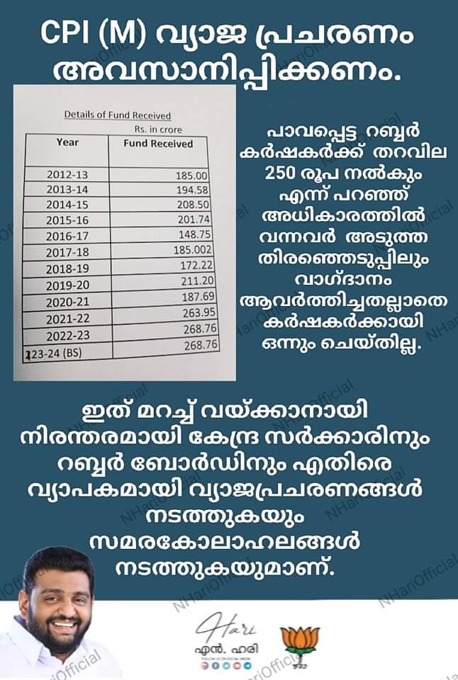 പാവപ്പെട്ട റബ്ബർ കർഷകർക്ക് തറവില 250 രൂപ നൽകും എന്ന് പറഞ്ഞ് അധികാരത്തിൽ വന്നവർ അടുത്ത തിരഞ്ഞെടുപ്പിലും വാഗ്ദാനം ആവർത്തിച്ചതല്ലാതെ കർഷകർക്കായി ഒന്നും ചെയ്തില്ല. ഇത് മറച്ച് വയ്ക്കാനായി നിരന്തരമായി കേന്ദ്ര സർക്കാരിനും റബ്ബർ ബോർഡിനും എതിരെ വ്യാപകമായി വ്യാജപ്രചരണങ്ങൾ നടത്തുകയും സമരകോലാഹലങ്ങൾ നടത്തുകയുമായിരുന്നു എന്ന് റബ്ബർ ബോർഡ് എക്സിക്യൂട്ടീവ് അംഗം എൻ.ഹരി.