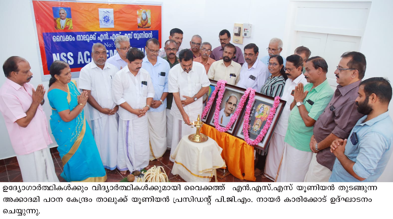 വൈക്കം: താലൂക്ക് എൻ എസ് എസ് യൂണിയൻ്റെ നേതൃത്വത്തിൽ വൈജ്ഞാനിക മേഖലയിൽ പുതിയ ഉണർന്ന് പകരുവാൻ കഴിയുന്ന എൻ എസ് എസ് അക്കാദമിക്ക് തുടക്കമായി. യൂണിയൻ ആസ്ഥാനത്ത് നടന്ന ലളിതമായ ചടങ്ങിൽ വച്ച് താലുക്ക് യൂണിയൻ പ്രസിഡൻ്റ് പി ജി എം നായർ കാരിക്കോട് ഭദ്രദീപം തെളിച്ച് ഉദ്ഘാടന കർമ്മം നിർവ്വഹിച്ചു. വൈസ് പ്രസിഡൻ്റ് പി വേണുഗോപാൽ അധ്യക്ഷത വഹിച്ചു. യൂണിയൻ സെക്രട്ടറി അക്കാദമി പ്രവർത്തനങ്ങൾ വിശദീകരിച്ചു.