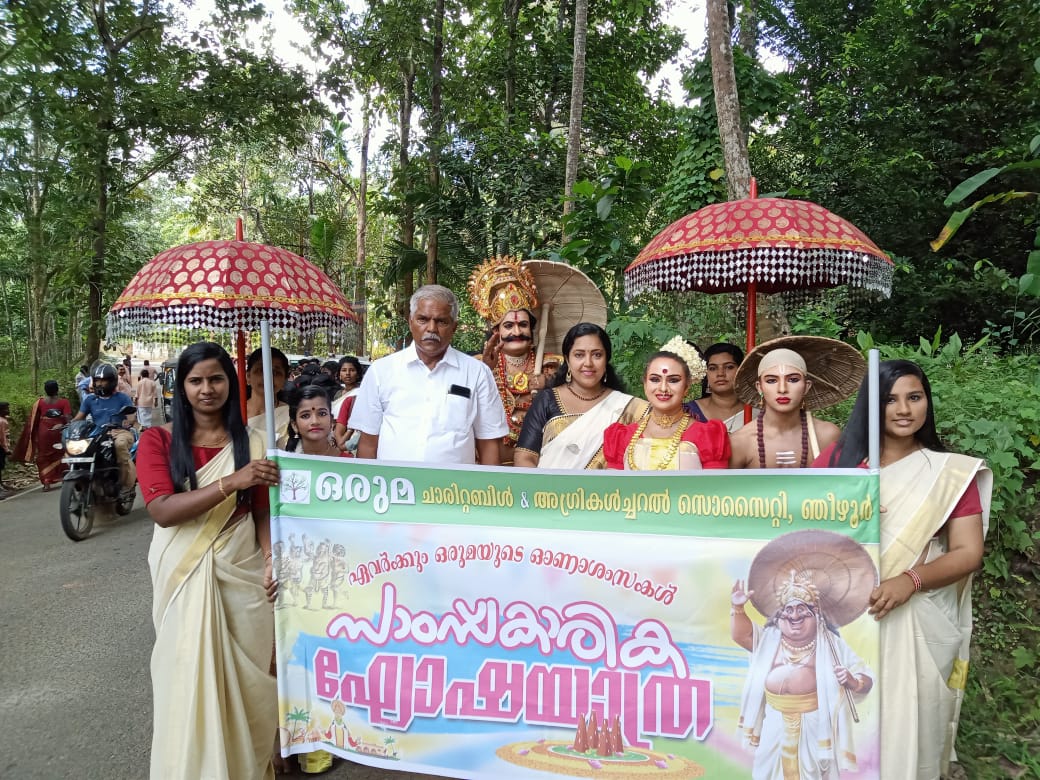 ഞീഴൂർ: ഞീഴൂർ ഒരുമ ചാരിറ്റബിൾ ആന്റ് അഗ്രികൾച്ചറൽ സെസൈറ്റിയുടെ ഓണാഘോഷവും, സൗജന്യ ഭക്ഷ്യക്കിറ്റ് വിതരണവും, നിർധന രോഗികൾക്കുള്ള ചികിത്സാ സഹായ വിതരണവും നടന്നു. ഓണാഘോഷത്തോടനുബന്ധിച്ച് ഞീഴൂർ ടൗണിൽ നിന്നും വാദ്യമേളങ്ങളുടെ അകമ്പടിയോടെ നടന്ന സാംസ്കാരിക ഘോഷയാത്ര വർണ്ണാഭമായി. സിനിമ സീരിയൽ താരം ടാനിയയും ഘോഷയാത്രയിൽ പങ്കെടുത്തു. ഒരുമ അങ്കണത്തിൽ നടന്ന ചടങ്ങിൽ വയോധികർക്ക് ഓണപുടവയും, കുട്ടികൾക്ക് ഓണക്കോടിയും വിതണo ചെയ്തു.സമ്മേളനം മോൻസ് ജോസഫ് എം.എൽ.എ ഉദ്ഘാടനം ചെയ്തു.