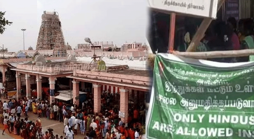തമിഴ്നാട്ടിലെ ദിണ്ടിഗൽ ജില്ലയിലെ പഴനി മലയോര ക്ഷേത്രത്തിൽ ഹിന്ദുക്കൾക്ക് മാത്രമേ പ്രവേശനമുള്ളൂ എന്ന നോട്ടീസ് ബോർഡ് തിരികെ വയ്ക്കാൻ ഹൈക്കോടതി മധുര ബ്രാഞ്ച് ജഡ്ജി ഉത്തരവിട്ടു. പഴനി ക്ഷേത്രത്തിൽ കുംഭാഭിഷേകത്തിന് മുമ്പ് വരെ ഹിന്ദുക്കൾക്ക് മാത്രമേ പ്രവേശനമുള്ളൂ എന്ന അറിയിപ്പ് ബോർഡ് ഉണ്ടായിരുന്നു.