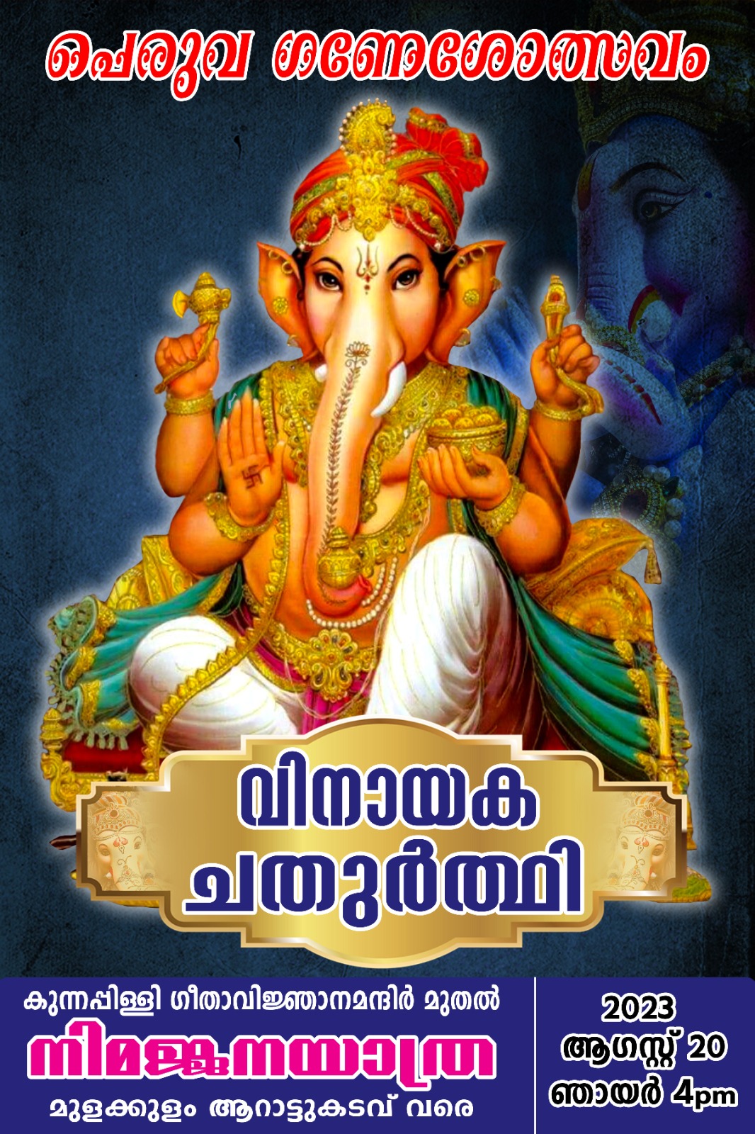 പെരുവ : ഗീതാ വിജ്ഞാനമന്ദിർ സേവാകേന്ദ്രത്തിന്റെ ആഭിമുഖ്യത്തിൽ ഈ വർഷത്തെ വിനായക ചതുർത്ഥി ഗണേശോത്സവമായി ഓഗസ്റ്റ് 18, 19, 20 തീയതികളിൽ ആഘോഷിയ്ക്കും.