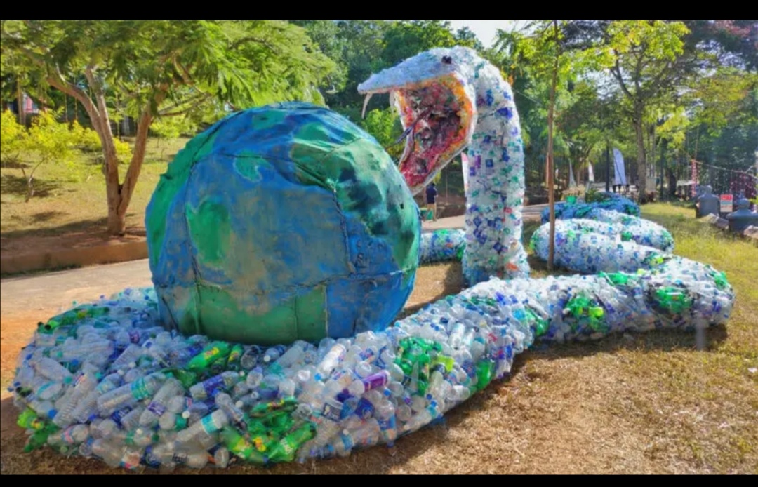 തിരുവനന്തപുരം: സംസ്ഥാന സര്ക്കാരിന്റെ ഓണം വാരാഘോഷത്തിന്റെ പ്രധാന വേദിയായ കനകക്കുന്നില് പ്ലാസ്റ്റിക് കുപ്പികള് കൊണ്ട് നിര്മിച്ച കൂറ്റന് സര്പ്പം ഭൂമിയെ വിഴുങ്ങുന്ന രൂപത്തിലാണ് പ്ലാസ്റ്റിക് വിരുദ്ധ സന്ദേശം. സംസ്ഥാന ശുചിത്വ മിഷന് കനകക്കുന്നിലെ പ്രവേശന കവാടത്തിന് സമീപം സ്ഥാപിച്ച ഇന്സ്റ്റലേഷനും ഇതിനോടകം ശ്രദ്ധേയമായി.