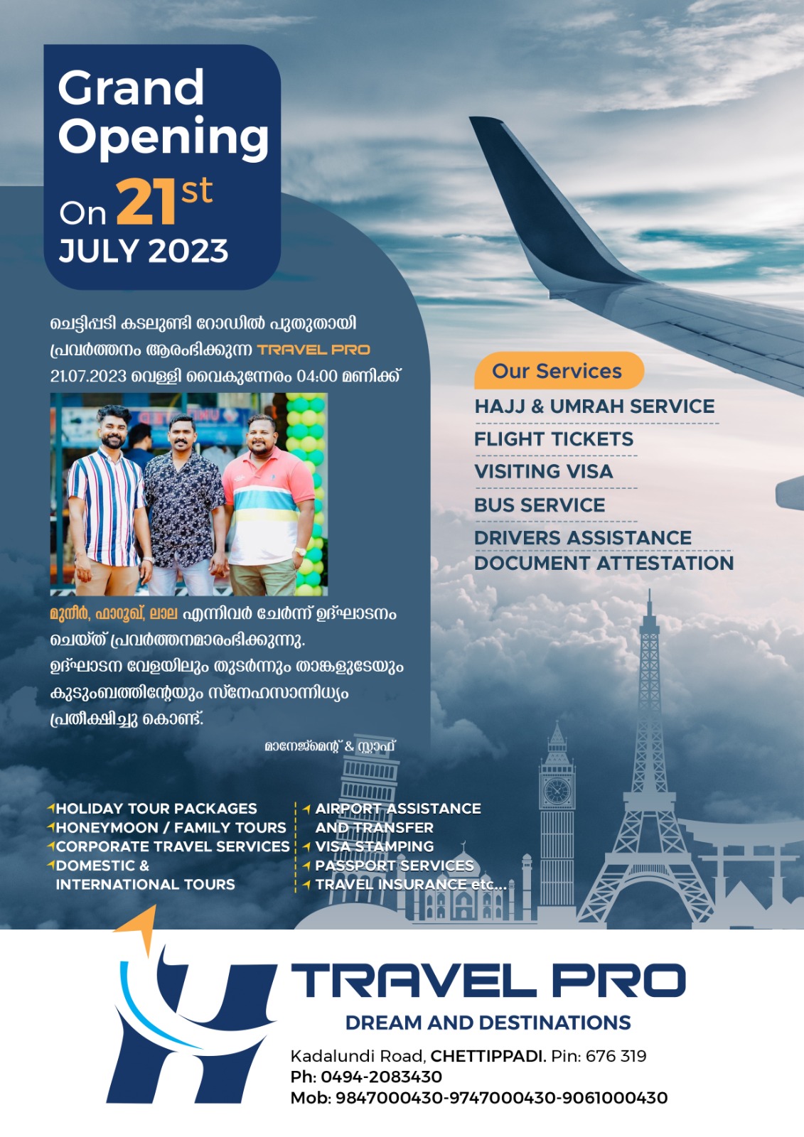 ട്രാവൽ പ്രോ നാളെ പ്രവർത്തനം ആരംഭിക്കുന്നു Local News 20/07/2023SwanthamLekhakanLeave a Comment on ട്രാവൽ പ്രോ നാളെ പ്രവർത്തനം ആരംഭിക്കുന്നു കോഴിക്കോട്: ചെട്ടിപ്പടി കടലുണ്ടി റോഡിൽ ട്രാവൽ പ്രോ നാളെ (21 /7 /2023 വെള്ളി) വൈകുന്നേരം 4 മണിക്ക് പ്രവർത്തനം ആരംഭിക്കുന്നു. ട്രാവൽ രംഗത്തെ വിവിധതരം സേവനങ്ങൾ വാഗ്ദാനം ചെയ്യുന്ന സ്ഥാപനം മുനീർ, ഫാറൂഖ്, ലാല എന്നിവർ ചേർന്ന് ഉദ്ഘാടനം ചെയ്യും.